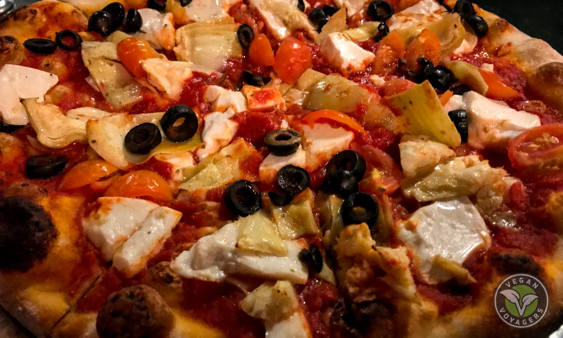 Specialty Order- Beer dough, jalapeno, vegan sausage, & Teese cheese- Aaron made this pizza on his own and originally ordered it with both kinds of cheese, but they only gave him the mozzarella cheese. The jalapenos were on FIRE and brought some serious heat to the pizza. The Teese cheese didn’t really melt on the pizza and resembled someone taking a block of cheese, cutting slices off, and placing them haphazardly around on the pizza. The vegan sausage had great flavor, but without the meltiness from the cheese, it fell off rather easily. Overall, the pizza was good but not nearly as good as the memories of the pizza from the year before. Beast Boy- Hand-tossed dough, black olives, artichoke, cherry tomatoes, & Teese cheese- On the menu, this pizza comes with walnut pesto, but they had run out of it, so Hayden had to settle for regular marinara. While the pizza was good, the same issue with Aaron’s pizza was prevalent, the haphazard tossed on chunks of unmelted cheese. I’m sure it would have been way better with the pesto, but it was equally satisfying. The artichokes, olives, and cherry tomatoes complimented each other really well and it was a delicious pizza overall.