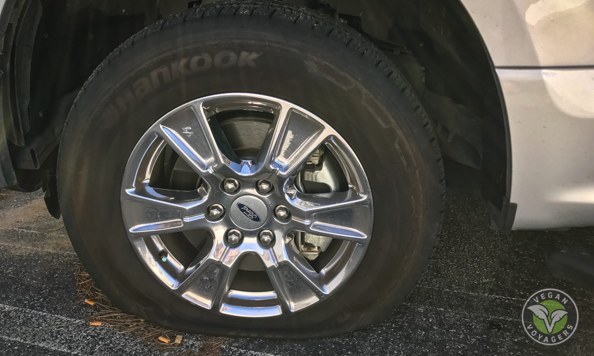 We were on our way to visit Hayden’s parents with the dog and chicken in the car. We first needed to stop by the post office to drop off some mail when we heard a hissing sound. We immediately pulled the truck over into a nearby parking lot just as the last of the air was coming out of the tire.