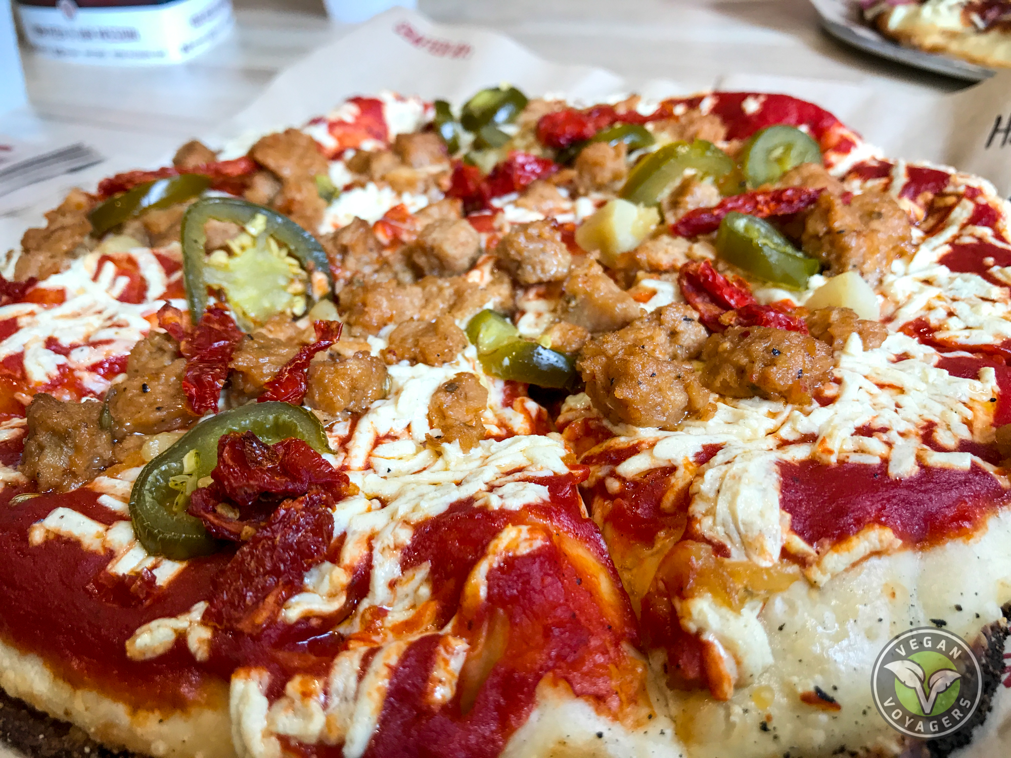 Pizza #1- Double dough, spicy organic tomato sauce, vegan sausage, jalapenos, sundried tomatoes, garlic, vegan cheese. This combination is killer! The heat from the spicy sauce and the jalepenos really goes well with the sundried tomatoes and sausage for an incredibly well rounded pizza that is easy to devour. This is definitely in the top 10 pizzas he’s ever had.