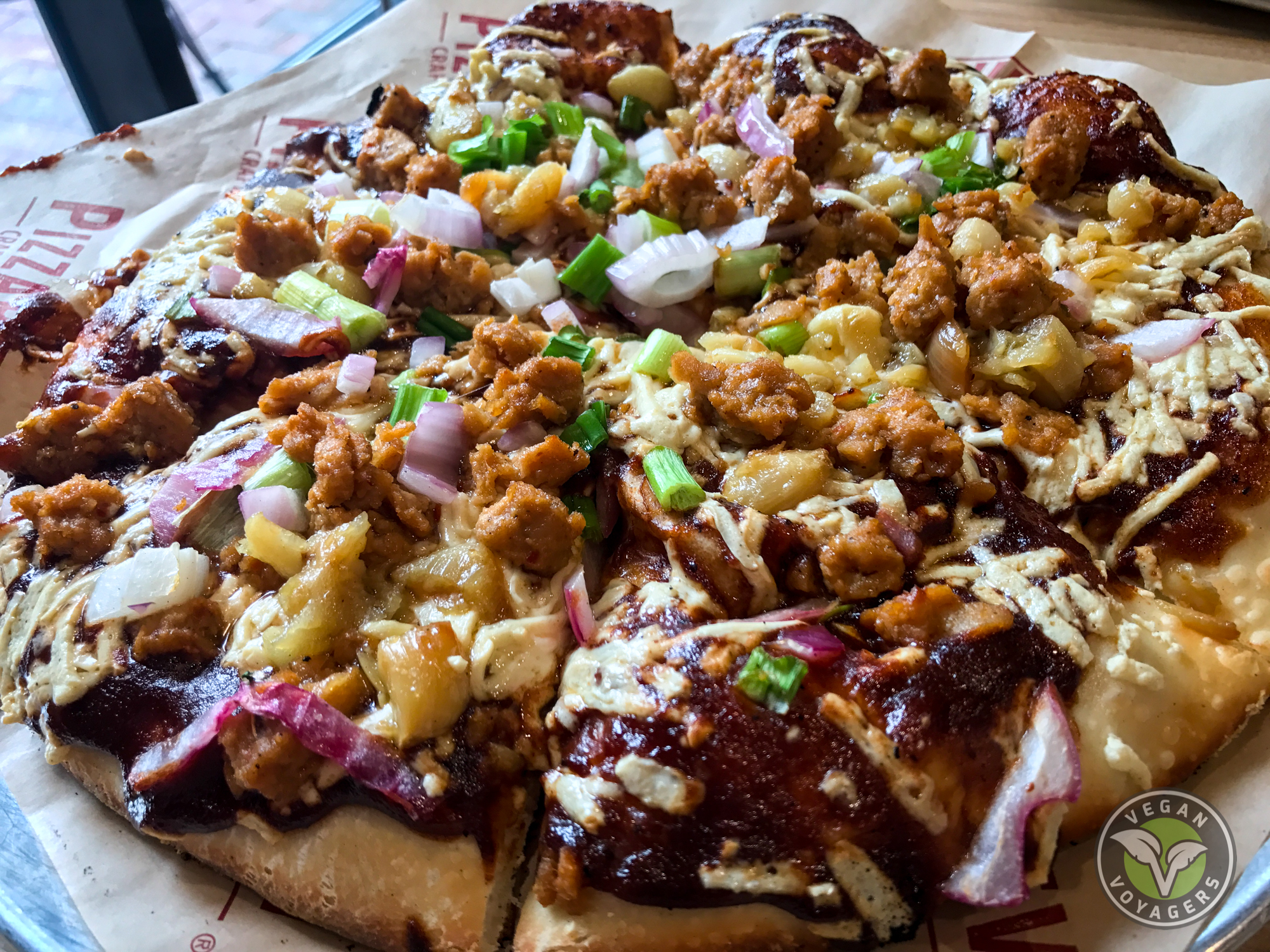 Pizza #2- Double dough, sweet & bold BBQ, vegan sausage, red and green onions, garlic, vegan cheese. Hayden has really turned Aaron on to the deliciousness that is the BBQ pizza and this one delivered on every level. Normally not a big fan of onions on pizza, but they really added a new depth of flavor that would have been missing had they not been there. While it was extremely delicious, he definitely preferred the first pizza.