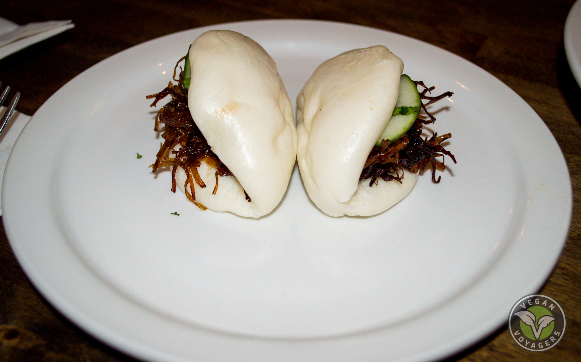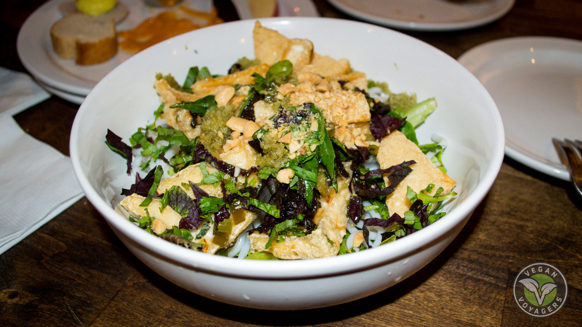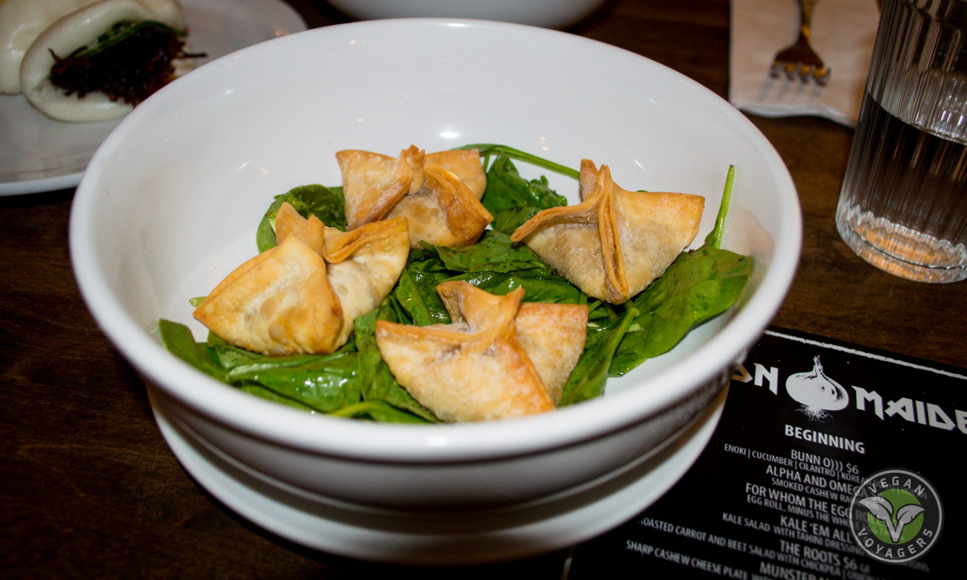Alpha and Omega- Smoked cashew Rangoon. For as simple as these are in terms of ingredients, they pack a lot of flavors! Rangoons aren’t something you come across very often as a vegan, so it definitely stood out to us on the menu. The crunchiness of the wrapper when combined with the smoked cashew filling really drive home a well-balanced appetizer. These also come on a bed of greens with an oil based dressing.