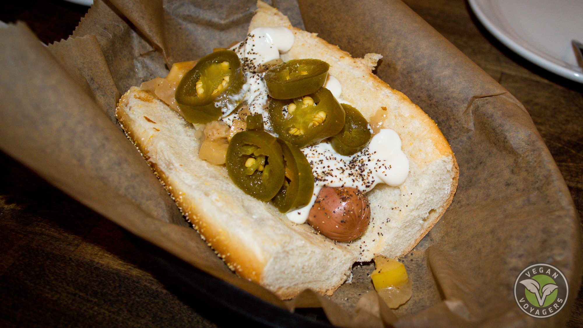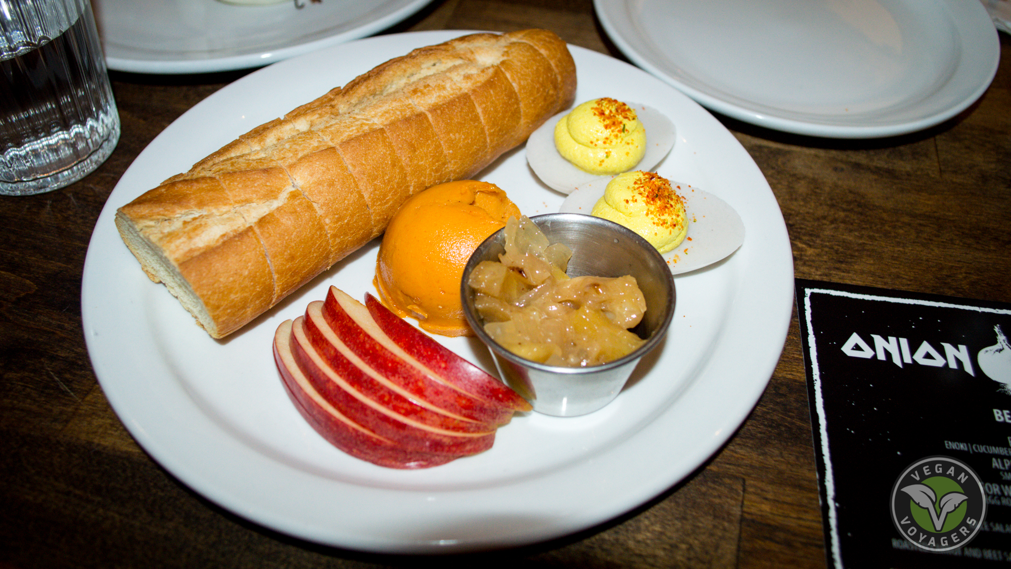 Munster Mash- Sharp cashew cheese plate with chutney, baguette, apples, & killing yoke deviled eggs. The sharp cheese, being cashew based, spreads incredibly well and definitely meets the sharpness of its name. Not sure you can go wrong with any cashew cheese, so naturally it was really good. This is the second time we’ve had vegan deviled eggs and both times we’ve been a bit weirded out. They are pretty good and the yolk has a distinct mustard-flavor, but as vegans, it’s just one of those things that reminds you too much of the real thing. The chutney also had great flavor and paired well with the apples and on top of the baguette with the cheese. Who doesn’t love a good cheese plate??