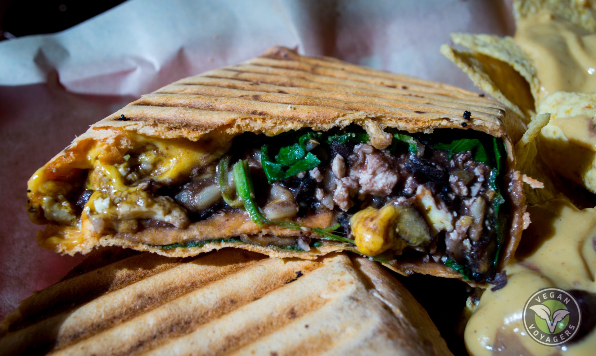 Tengo Hambre (Breakfast Burrito)- Tofu Scramble, Quinoa, Brown Rice, Spinach, Black Beans, and Vegan Cheese on a Tortilla Wrap with Housemade Pico de Gallo. This was pretty good, but definitely needs some time to cool off before eating it as it came out of the press piping hot. The chips were upgraded to nachos which also were pretty good but could have used more toppings.