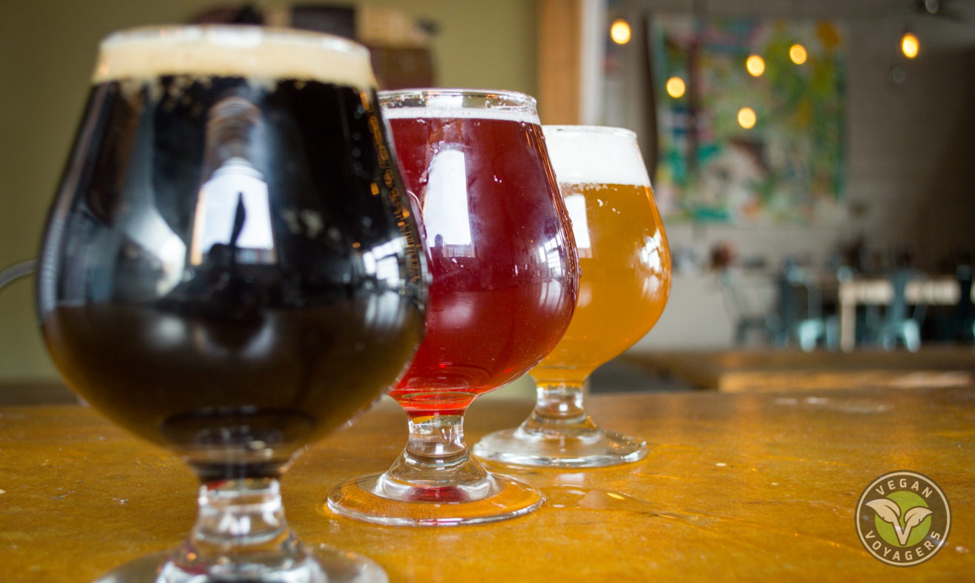 They let us come by before they had opened so that we could have an uninterrupted interview while they finished up their brewing tasks for the day. We scoped out the inside of the brewpub and found a few locations we wanted to shoot in front of as they have some great interior design. Starting out in front of the “drink local” sign, we asked them our introduction questions about how the brewery was started and a little bit about themselves. Lisa told us all about the wonderful advocacy work that they do and Joe walked us through the process of how they make beer before moving onto the bar where they went over all of the different beers they had on tap, including one of their collaborations with No Evil Foods.