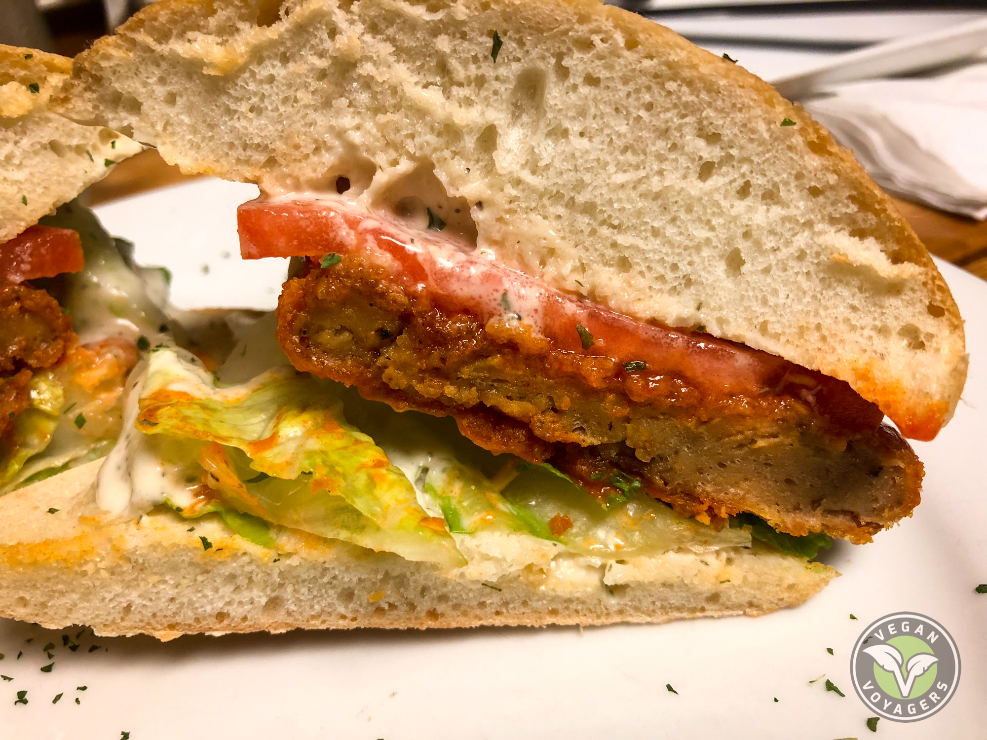 Crispy Chicken Sandwich- chicken style seitan, romaine lettuce, mayo, tomato, served on ciabatta, upgrade to buffalo ranch. OF COURSE, we upgraded to buffalo ranch! The ciabatta roll came out a little warm still, which made the bread soft and easy to bite into, the seitan was pretty good, a little dense, but had good flavor. The star of the show was the buffalo and ranch.